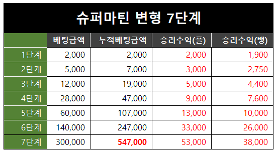 슈퍼마틴 변형 7단계로 : 2개에서 꺽기 베팅이라........