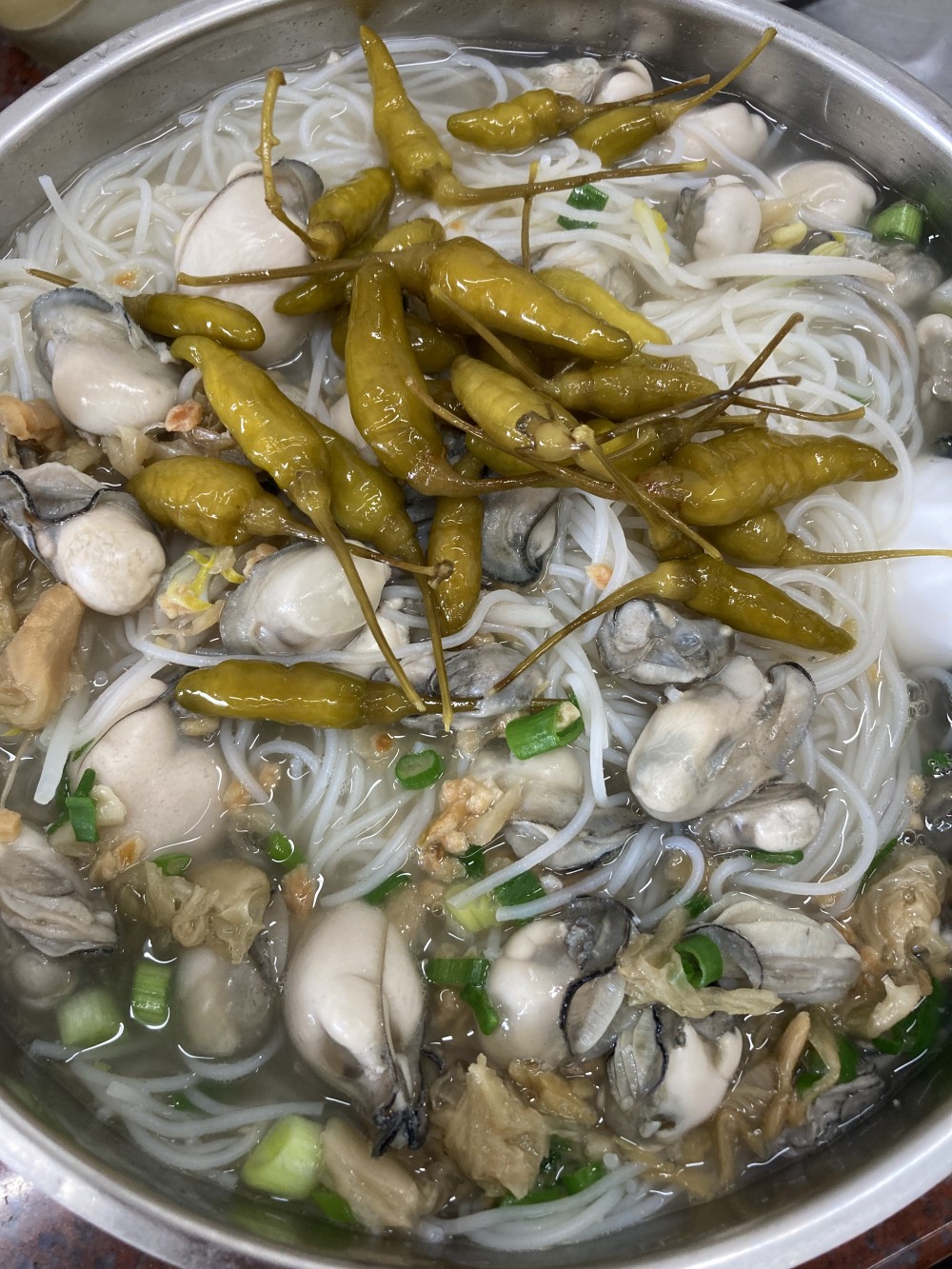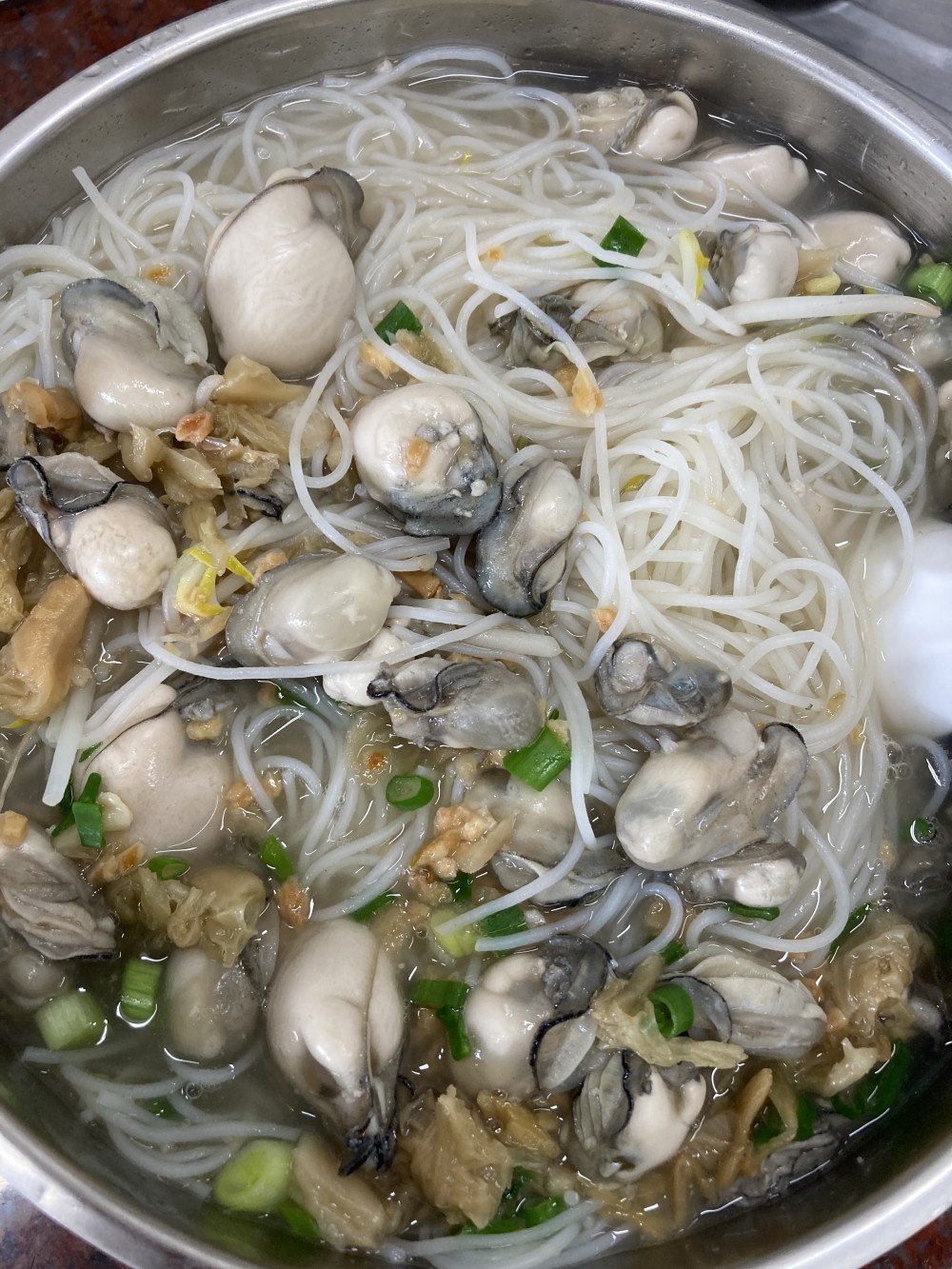 작은 굴들이 잔뜩 들어가있고 씻은 김치살짝 들어가있어요 ^^ 국물맛이 예술 면은 쌀국수면으로