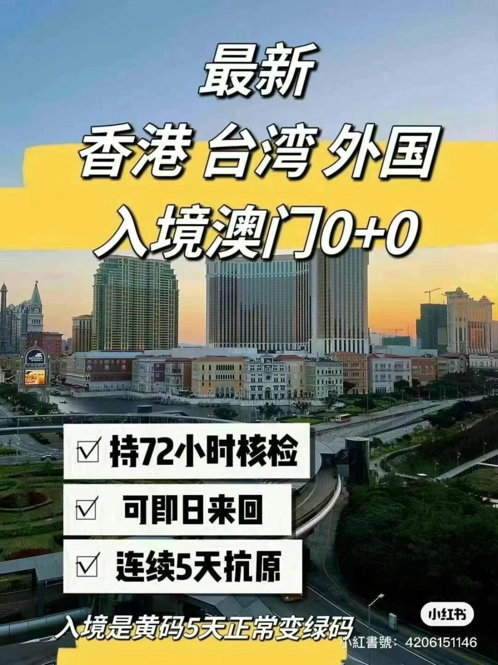 시행일 및 대상 : 23.1.8(일) 00:00 이후 마카오 입국하는 모든 사람1. 한국 국적자를 포함한 전세계 모든 사람은 마카오에 사전 허가 없이 입경할 수 있습니다.2. 마카오 입경을 위해 건강상태신고서 작성, 입경 후 격리, 능동감시, 자가건강검진 등…