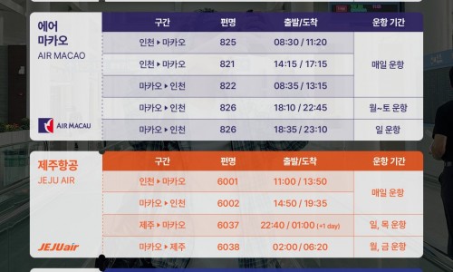[운항 정보📅]✈️ 대한항공 - 매일 운항인천 10:20 출발 - 13:05 도착마카오 14:10 출발 - 19:00 도착✈️ 에어마카오 - 매일 운항인천 07:50 출발 - 10:45 도착인천 14:15 출발 - 17:15 도착마카오 08:35 출발 -…
