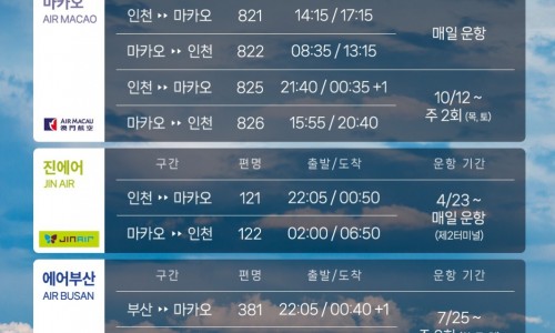 ‘목요일, 토요일 저녁 Fly to the MACAU‘10월12일 부터 매주 목요일/토요일 저녁 주2회,“인천발 마카오행 에어마카오 NX825편 이륙합니다”Two Daily 운항, 얼마 남지 않았습니다.▶ 운항정보 매일운항▶&nb…
