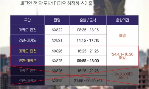 4월 1일 부터 인천 <->마카오 ‘매일 2회 운항’을 시작한다고 합니다.마카오 여행하기 가장 좋은 시간대로 확정!신규 스케줄은4월~ 매일 운항 스케줄 *마카오–인천 08:35 – 13:15 *인천–마카오&n…