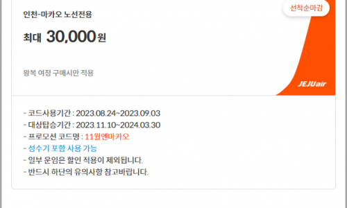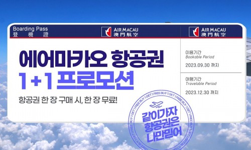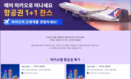 에어 마카오 선착순 항공권 1+1· 이벤트 기간: 2023년 3월 31일까지 결제/발권· 예약 방법: 여기 클릭 후 원하는 날짜 선택 후프로모션 항공권 구매 / 발권 가능· 참고: 2인 예매 시 1…