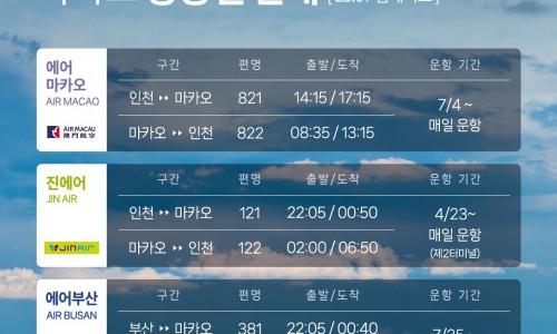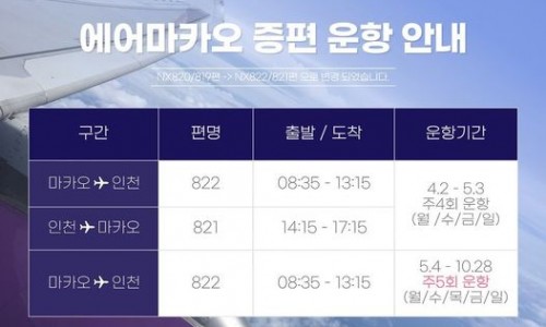 에어마카오 항공이 5월 4일부터는주 5회 운항으로 증편 된답니다! 운항정보4.2 – 5.3 주4회 (월/수/금/일)5.4 – 10.28 주5회 (월/수/목/금/일)