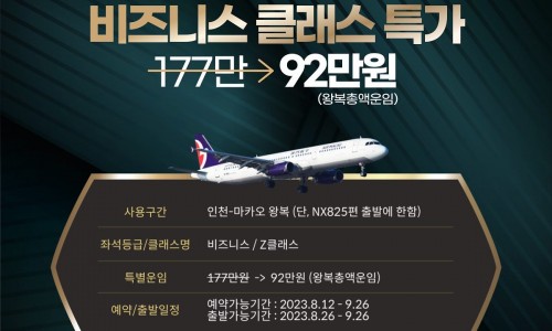비즈니스 Z클래스 타고, 더욱 편안하고 품격있는 여행을 시작해보세요.왕복총액 특가로 비즈니스 클래스를 경험하세요!⊙ 좌석등급/클래스명 : 비즈니스 /Z클래스⊙ 특별운임 : 177만원 -> 92만원 (왕복총액운임)⊙ 예약기간 : 2023.08.12 - 0…