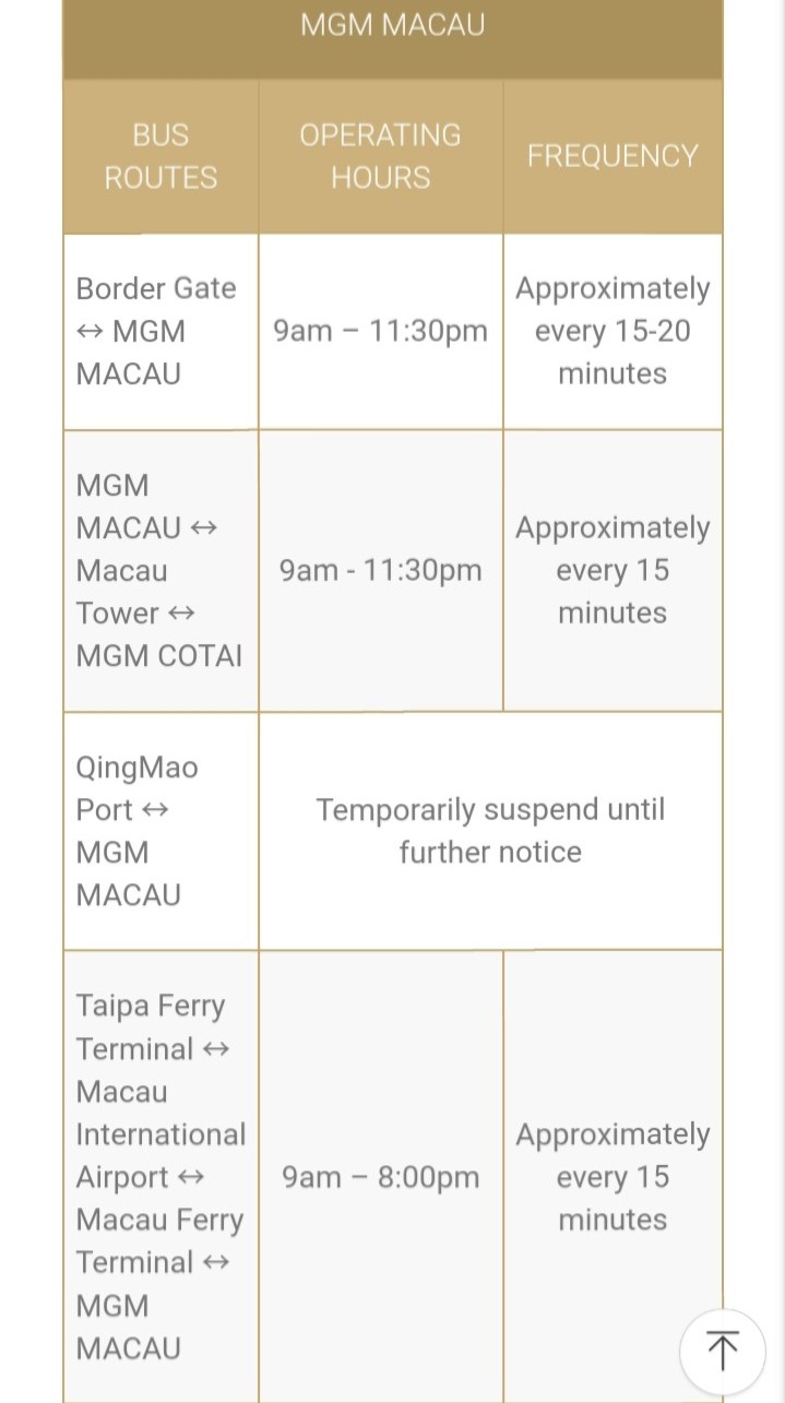 MGM COTAI 호텔 무료셔틀 스케줄