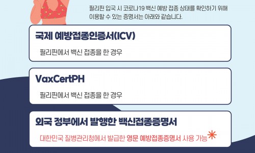 코로나19 예방접종증명서Certification of Vaccine for COVID 19해당 안내는 필리핀 입국에 대한 최소한의 정보 제공 목적으로 작성되었으며, 입국을 책임지지 않습니다. 입국 규정은 수시로 변경될 수 있으므로 필리핀 이민국(BI)의 최신 입국 규정…