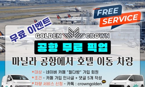 여러분 드디어 필다방 네이버 카페를 오픈하였습니다 ^^ 회원분들의 접근성도 높으며 앞으로 점차 커질 필다방빨리~ 가입하시고 초장기 맴버분들은 여러가지 해택이 있답니다 ^^우선 첫번째 !공항에서 마닐라 시내 시내에서 공항으로 …